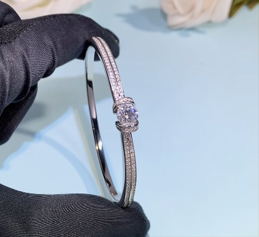 The bracelet features a stunning 1.76 carat moissanite stone with dimensions of 46*56. Moissanite is renowned for its exceptional brilliance and fire, rivaling that of a diamond. The double-row fully inlaid design creates a captivating look that is both elegant and modern.
