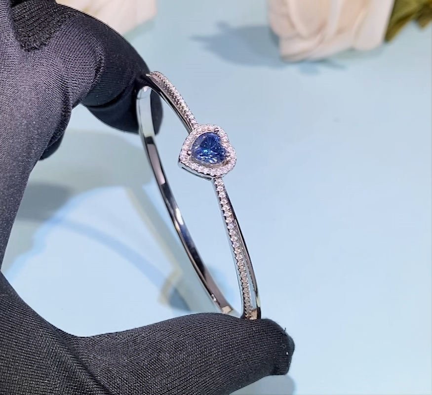 The Xindeyi bracelet (item No. AZ935-S) is a stunning piece of jewelry. Crafted from 925 sterling silver and plated with PT950 gold, it features a beautiful sapphire blue moissanite and a heart-shaped wrap, exuding sweetness and loveliness.